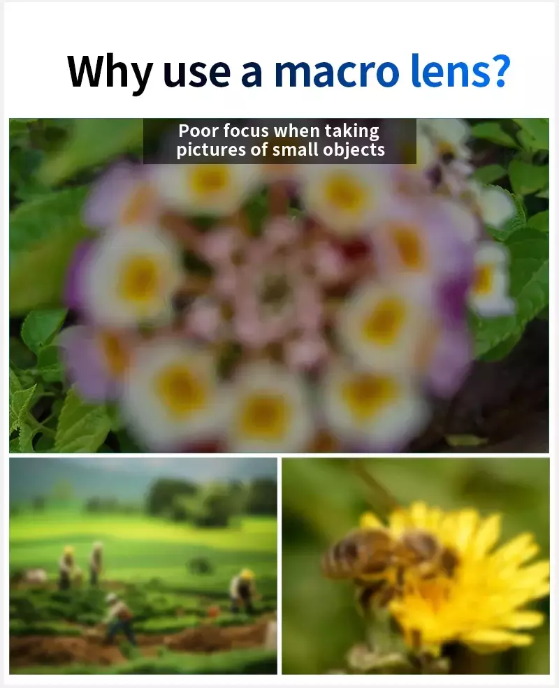 1. Perfeitamente compatível com a lente macro do DJI Pocket 3, revestimento multicamada, impermeável, resistente a riscos, à prova de poeira e resistente a óleo, protegendo sua lente DJI Pocket 3 de danos gerais. Ao mesmo tempo, a lente macro ajuda você a capturar uma visão mais detalhada e de alta definição. Nossa ampliação da lente macro é x10, que pode ampliar a imagem dez vezes, com uma distância de focagem de 25-40mm, focagem precisa, capturando todos os detalhes intrincados, capturar detalhes emocionantes, como plantas e animais em um novo mundo microscópico, e tirar fotos macro claras o tempo todo. (Para melhores resultados, por favor coloque a lente macro a uma distância de cerca de 20-40mm do objeto.)