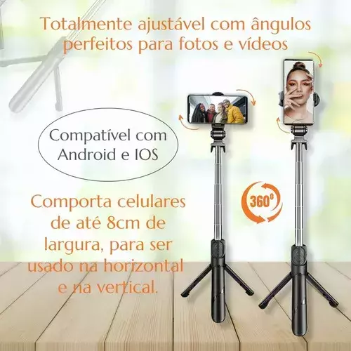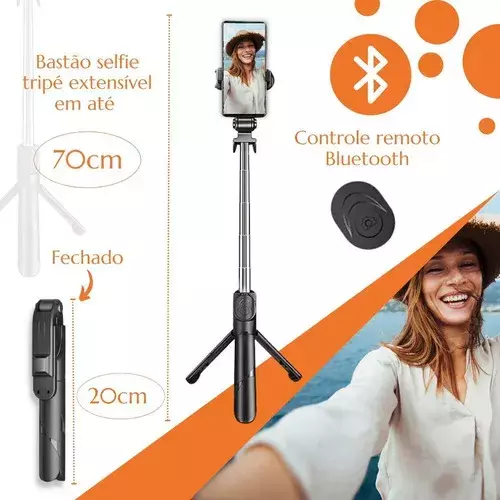 Projetado para tirar selfie com um toque. Acompanha Bastão selfie tripé extensível em até 70 centímetros.